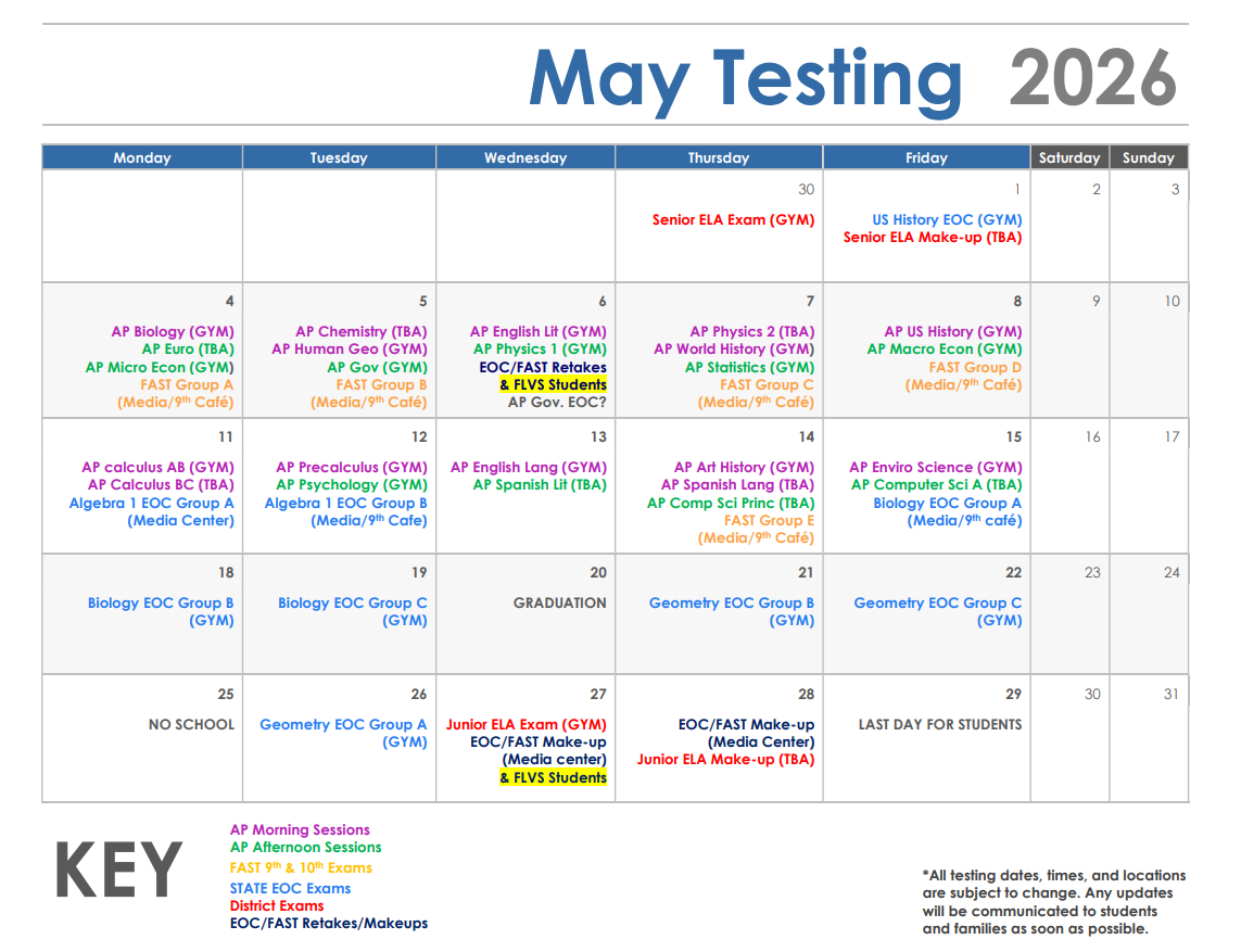 📢 Attention Testing Students: If you would like to be included in the Retakes for B.E.S.T. Algebra 1, Geometry, Biology 1, Civics, and U.S. History EOCs, please see your Ms. Teuscher in the Media Center to get signed up for testing (deadline is April 15, 2026).